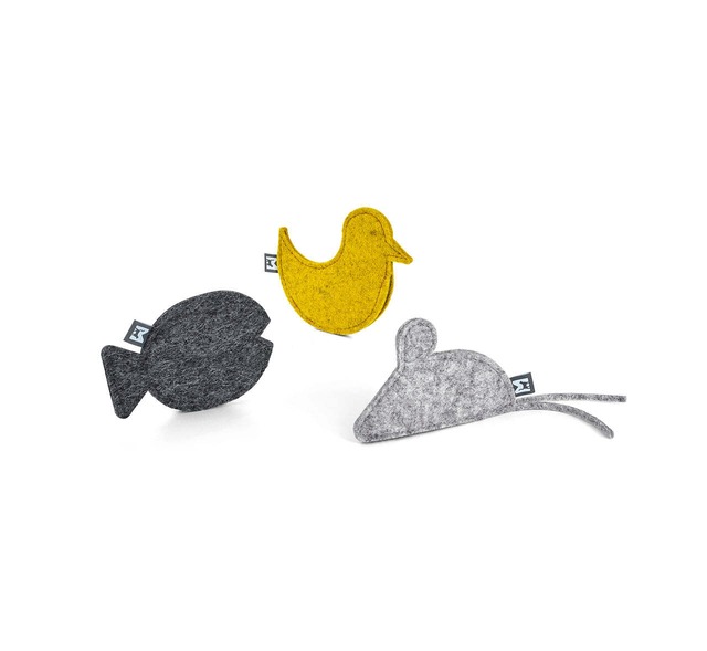 【商品紹介】 Bosco Cat Toyは、家猫との遊び時間に新しいエネルギーと変化をもたらします。 手作りのボスコキャットトイは、天然のウールフェルトで作られており、抱きしめたり、ぬいぐるみのように安全に使用できます。 ベルクロ留め具と綿製の縫い付け袋により、猫草はおもちゃの中に留まり、家の中に散らばることはありません。 ミニマルなスカンジナビア風の動物の形が、ボスコキャットトイを猫の家にぴったりの装飾アイテムにしています。 ※この商品は個別販売です。 【サイズ】 Bird: 約11.6 x 10 cm Mouse: 約20 x 7.2 cm Fish: 約11.2 x 8 cm 【素材】 ■フェルト 100% ウール ■詰め物 100% コットン 【お手入れ】 汚れは湿った布で優しく拭き取ってください。こすらないようにし、洗剤は使用しないでください。汚れやほこりは定期的にブラシで取り除いてください。 この犬用おもちゃは引っ張り合い遊びには適していません。噛んだり引っ張ったりすると、おもちゃが破損する恐れがあります。また、このおもちゃはペット専用です。子供の使用を目的としたものではありません。