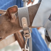 愛犬に、 MOONSTONEドッグカラーを贈りましょう。幅広デザインで快適性とサポート力を高めた、特別なデザインです。上質なカーフスキンレザーを使用し、グラファイトクロコ型押しとパールグレーのツートンカラーが、控えめなエレガンスを醸し出します。高級感のあるシルバーの金具で仕上げた、洗練されたカラーで、ペットのワードローブをワンランクアップさせましょう。
