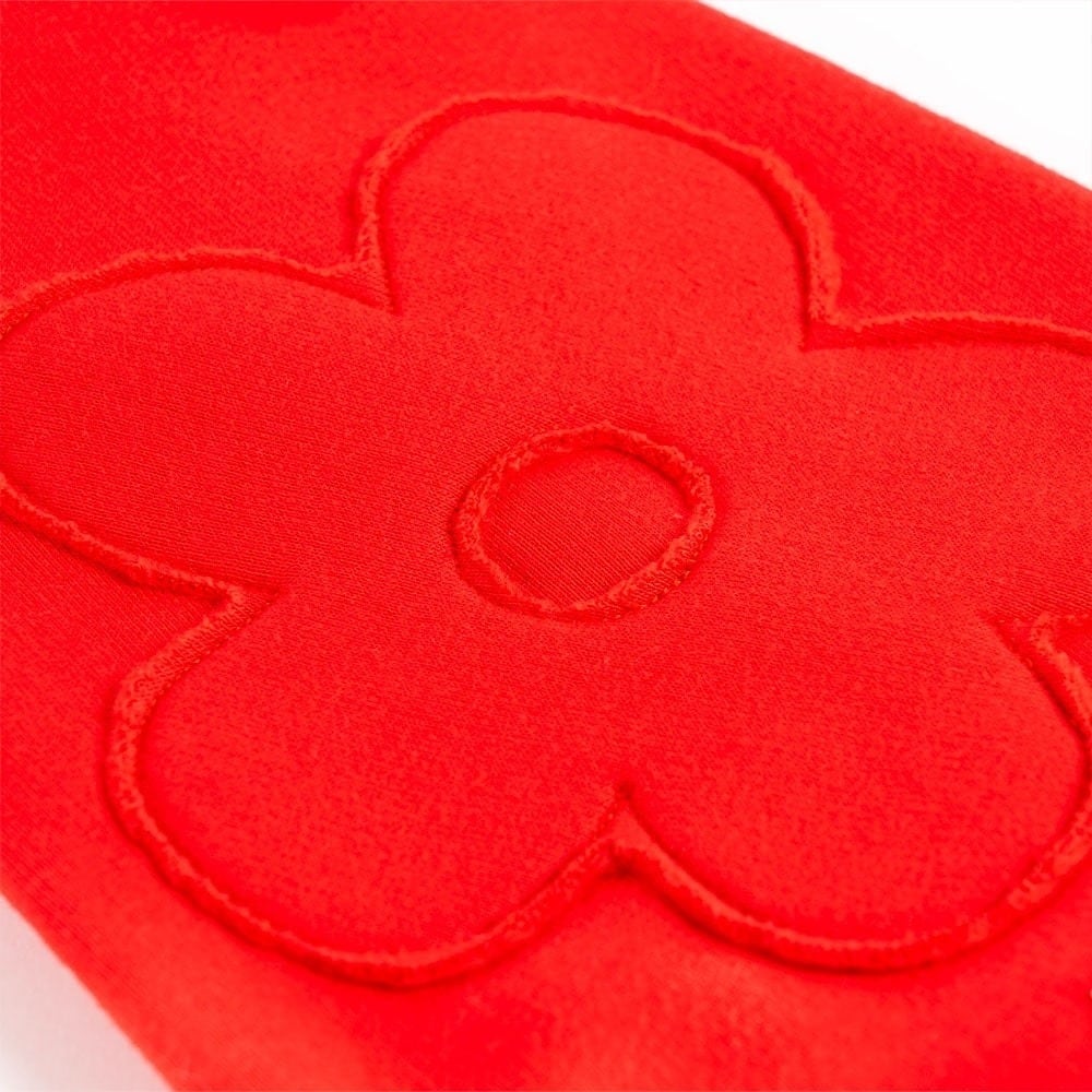 Red cotton dog sweatshirt with appliqué flower は、来る寒い季節をスタイリッシュかつシンプルに乗り切るのにぴったりの一枚です。フリース素材のコットンで作られているため、暖かく快適な着心地で、ミニマルなモノクロデザインがお好みの方には特におすすめです。