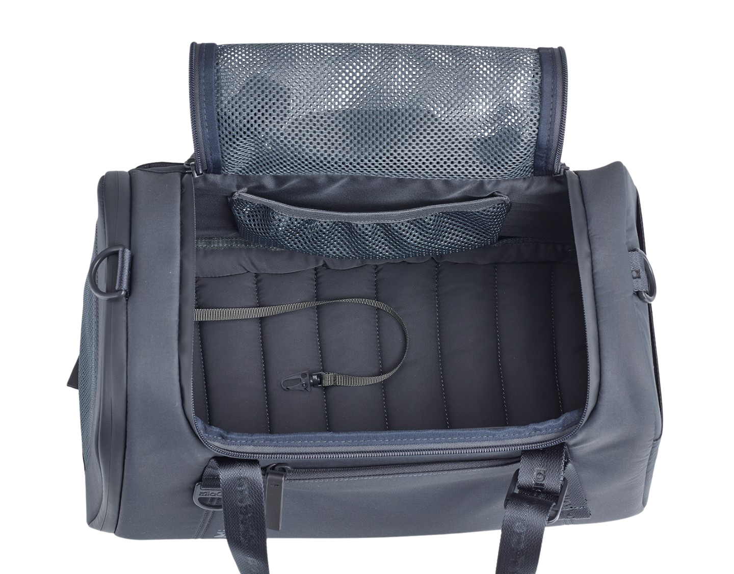 バッグの内部は、クリーニングや小休憩のために取り外し可能な柔らかいパッド入りマットレスが装備されています。手持ちや付属のパッド入りストラップで肩にかけることも、またはスーツケースのハンドルに快適に取り付けることができます。このバッグは、水は弾くポリエステル製で、100%リサイクルPETボトルから作られています。環境に優しく、とても頑丈です。